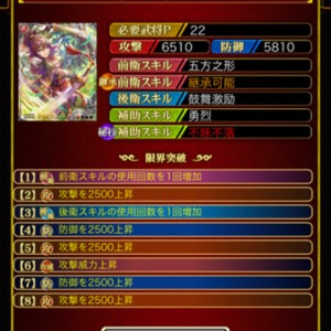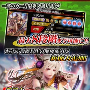 戦国炎舞では基本的に4回まで限界突破ができるようになっていますが、一部のカードは8回限界突破できる。限界突破すれば突破した分だけカードが強くなります。