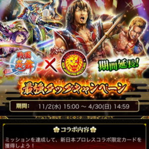 「戦国炎舞 -KIZNA-」にて開催されている「新日本プロレス」とのコラボイベントの開催期間が延長中!2016年11月2日から2017年4月30日14:59まで。