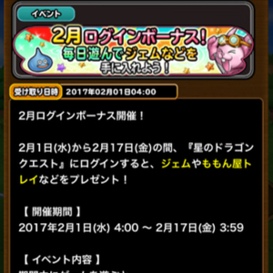 「星のドラゴンクエスト」にて2月1日から2月17日の間にログインすると、ジェムやももん屋トレイなどがプレゼントされます。開催期間は2月1日4:00から2月17日3:59まで。