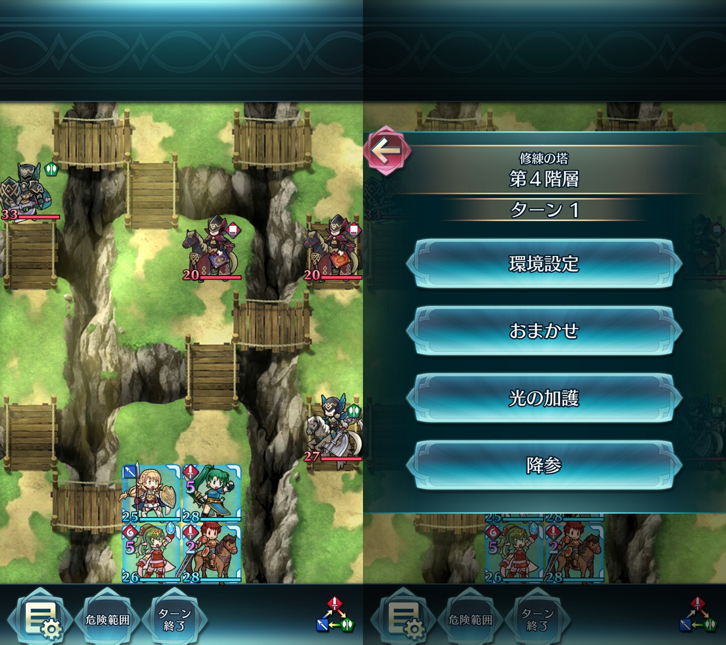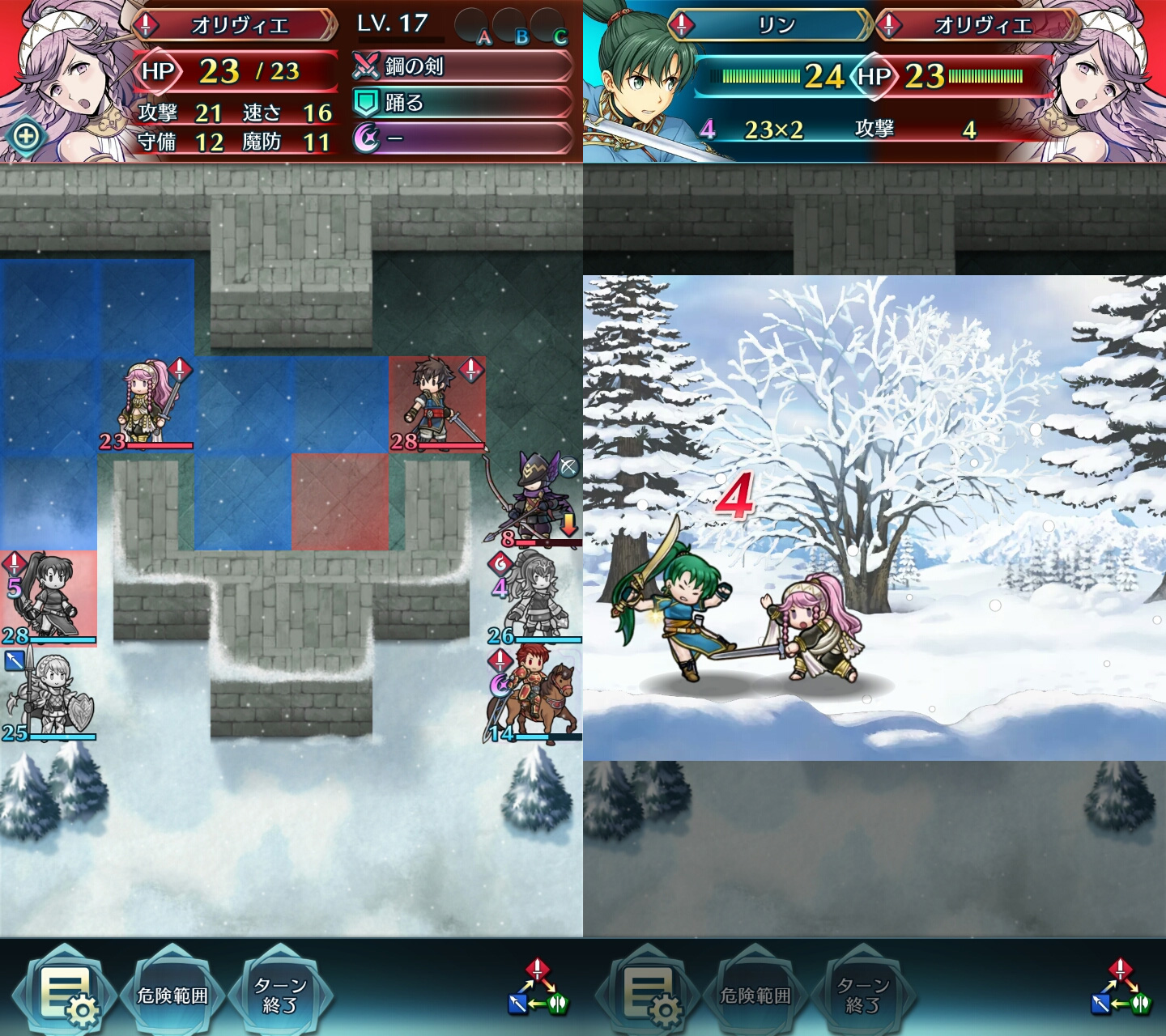 そこで、敵の危険範囲ギリギリに防御もしくは魔防が高いキャラを配置してターンを消化させ、敵を接近させてから反撃でHPを削り、自ターンで一斉攻撃をしかけることが基本的な戦術になります。