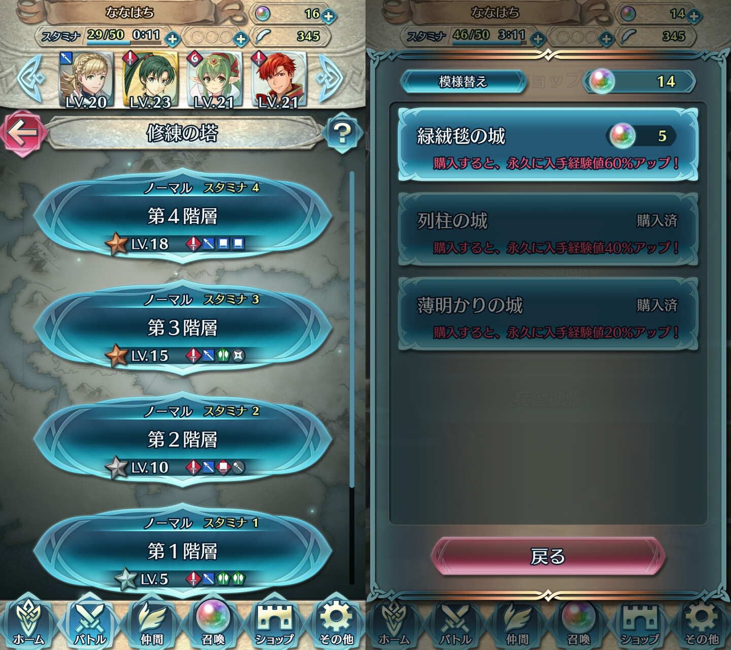 まずは、準備として「エリートの城」メニューを開き、薄明かりの城と列柱の城を購入して入手経験値を底上げしておきましょう。