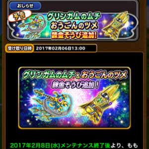 「星のドラゴンクエスト」にて2月8日のメンテナンス終了後にももん屋の「そうび錬金工房」にて作成できるそうびに「グリンガムのムチ」「おうごんのツメ」が追加されることが発表されました。