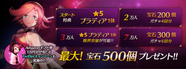 事前登録者数が 7 万人を突破いたしましたので、「宝石 500 個(11 連ガチャ 1 回分)」と、★5 キャラクター「プラディア 2 体」のプレゼントが決定いたしました!