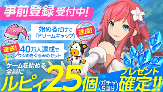 事前登録数に応じて、サービス開始後にゲーム内でもらえる報酬内容がランクアップするキャンペーンを実施中ですが、この度、事前登録数が 40 万人を突破したため、「ルピィ 25 個」と「50,000 ゴールド」、「ウシのきぐるみセット」までのプレゼントが確定いたしました。