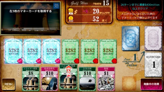 画面上側がマネーカード(単位は兆)で、下側が手札。金額を上下させる物、カードを回収する物、人口を調整するものなど。