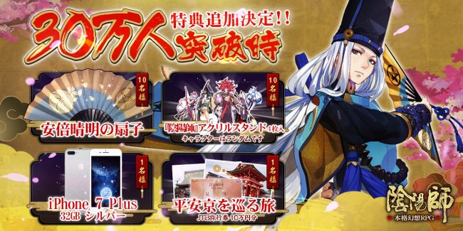 事前登録30万人突破記念!iPhone7やJTB旅行券10万円分、陰陽師オリジナルグッズを抽選でプレゼント!