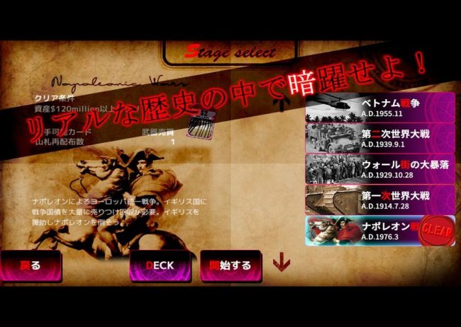第二次世界大戦やウォール街の大暴落などの各ステージをあなたは戦略と知略、そして運を使いクリアできるか。