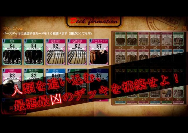 世界を裏で操る巨大組織のボス「死の商人」として、世界を人類を操る1人プレイ用ブラックカードゲームです。