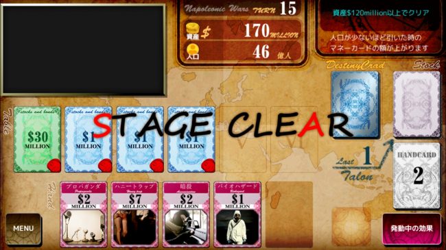 手札の効力を見極めた戦略と良いカードを引き当てる運で、各ステージのクリア条件を満たす必要があります。