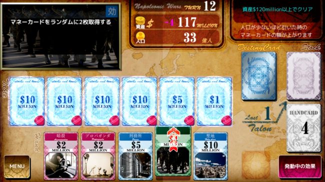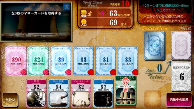 手札にはそれぞれ様々な効力があり、マネーカードを獲得するものや、人口 / 資金を増減させるものがあります。