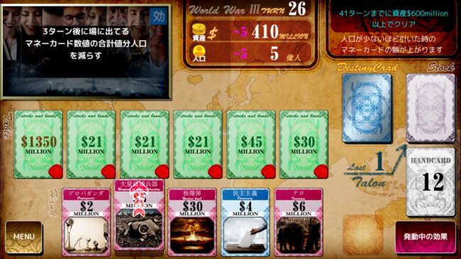ざっくりゲーム性を伝えると、兵器(カード)で人口を減らして場の資金(マネーカード)を跳ね上げ、美味しい所を掻っ攫うという悪魔のようなコンセプト。