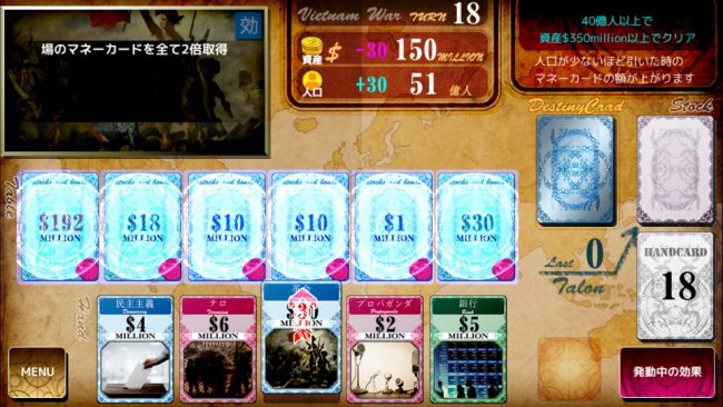 画面上側がマネーカード(単位は兆)で、下側が手札。金額を上下させる物、カードを回収する物、人口を調整するものなど。