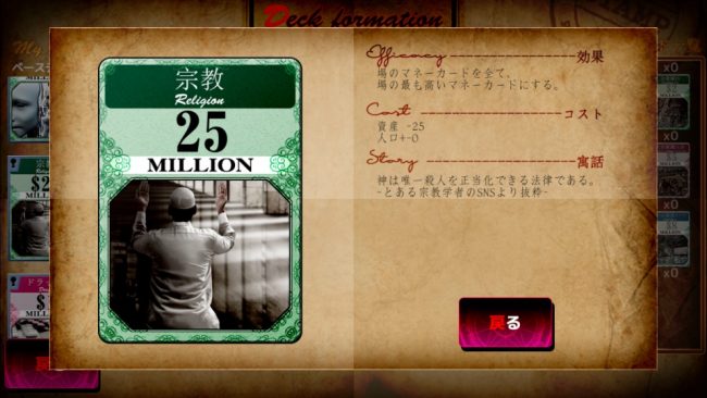 異質なのはその世界観。戦争・ドラッグ・宗教・銀行・国際連合・人工地震・核爆弾……あらゆる要素をカードとして使い、人類・経済をコントロール。