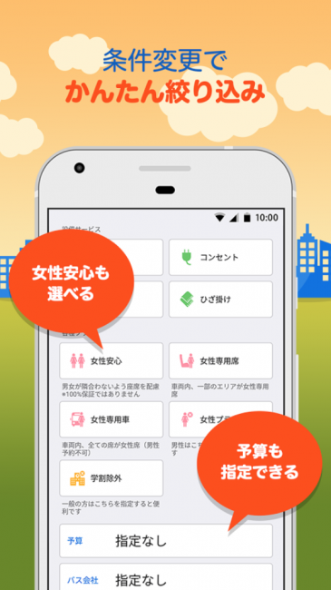 女性も安心、電源付きバスも簡単に見つかる。こだわり検索が充実。