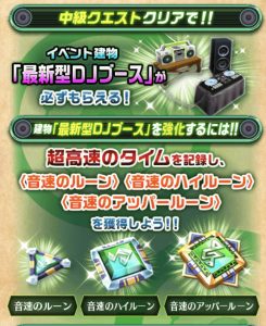 中級クリアで貰えるタウン施設のDJブースは、同イベントで入手できる3種の音速のルーンを用いての育成が可能である。