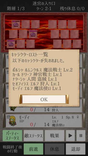 バトルシステムは、基本はオートバトルだが、回数制限のある回復「休息」やダンジョンを途中退場する「退却」なども選択可能。