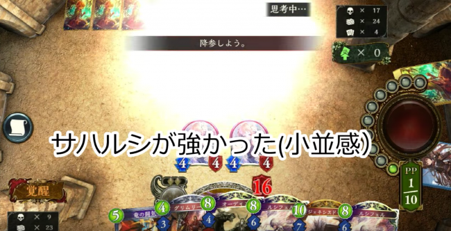 しかし、相手もドロー運が悪かったのか投了!助かった…。