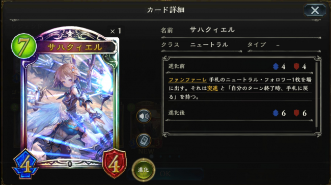 効果:ファンファーレ 手札のニュートラル・フォロワー1枚を場に出す。それは突進 と「自分のターン終了時、手札に戻る」を持つ。