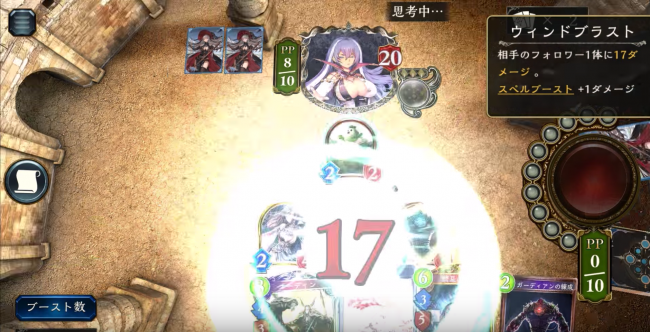 相手の体力は18点。こちらの方が圧倒的に少ないですが、手札が枯れている相手にはきついでしょう。