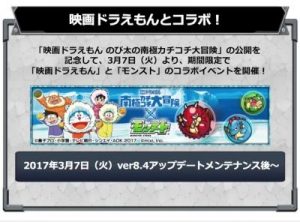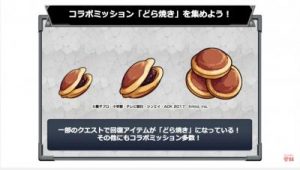 ドラえもんコラボのクエストでは回復アイテムのハートがどら焼きになる。そのどら焼きを回収することで、どら焼きをゲットできる。 大きさには三段階あり、最大まで成長させることで一気にどら焼きを3個ゲットできる。