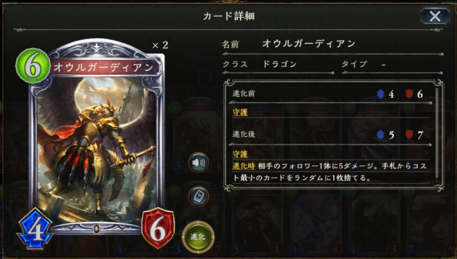 進化時 相手のフォロワー1体に5ダメージ。手札からコスト最小のカードをランダムに1枚捨てる。