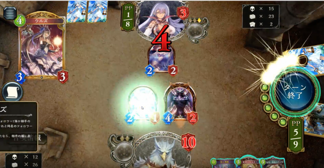 そして最後は、場にあるフォロワーで攻撃、「ウルズ」で疾走フォロワー再利用、「死の舞踏」でフィニッシュ。