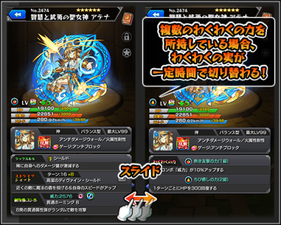 ステータスの「ラックスキル」「ストライクショット」「友情コンボ・副友情コンボ」の表示と、「わくわくの力」の表示はスライドをすることで切り替えられます。