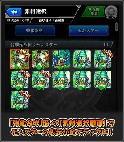 「強化合成」の「素材選択画面」で、「合成元&同じモンスター」「その他のモンスター」の表示がこれまで「レベル」表記でしたが、全て「ラック」表記に変更になり、同じモンスターを合成する際に便利になります。