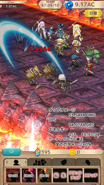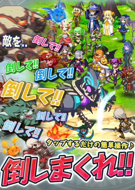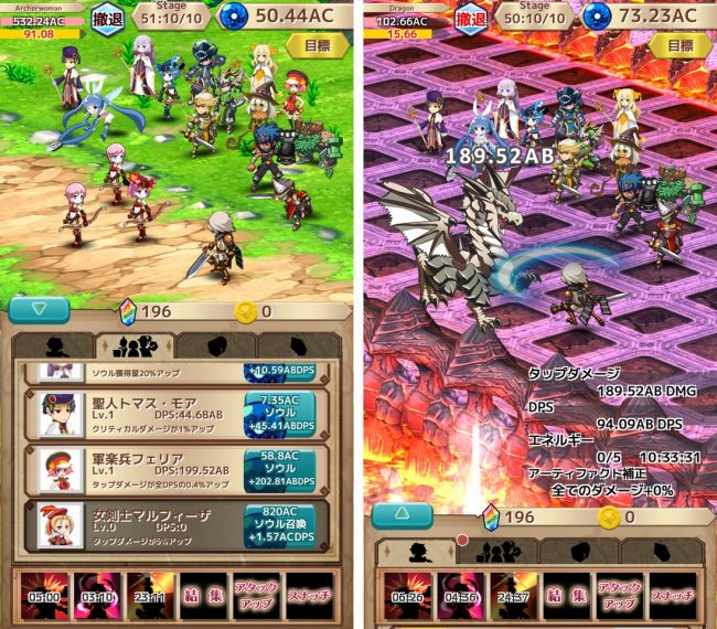 タップ攻撃と味方の自動攻撃でダメージを与え、DPSを強化してどんどんインフレさせていくクリッカー+放置RPGタイプ。