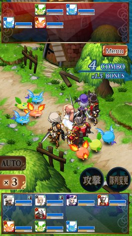 4×3のマス目へあらかじめユニットを配置、戦闘はターン制でほぼオート進行。掛け声ボイス付き。