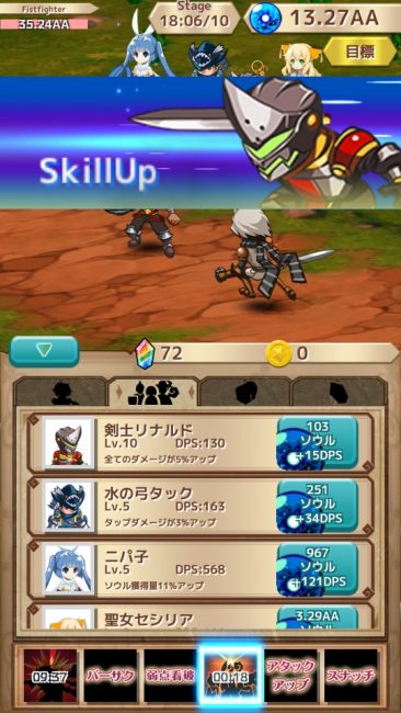 タップ攻撃と味方の自動攻撃でダメージを与え、DPSを強化してどんどんインフレさせていくクリッカー+放置RPGタイプ。
