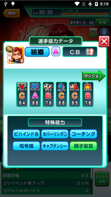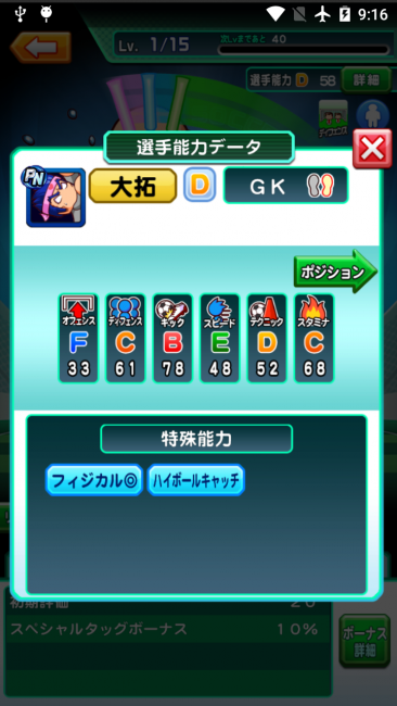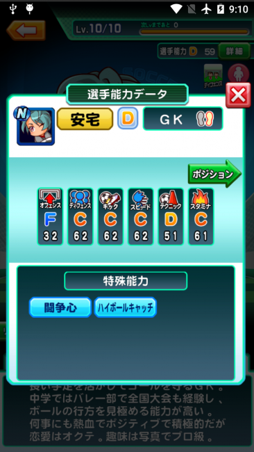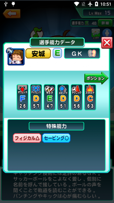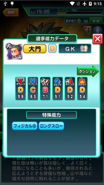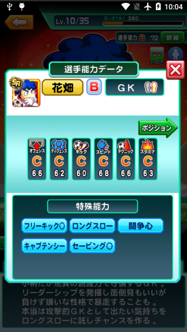 特殊能力が他のキャラに比べて多く、試合ではゴールを守るだけでなく、味方の指揮もあげてくれます。