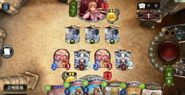 手元には「神魔裁判所」「テミスの審判」が2枚づつあるのは心強いですが、中盤までどう展開していくか迷う手札になっていますね。