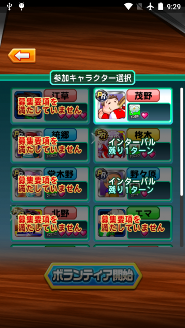 参加キャラクター選択画面では「選択できるキャラ」「募集要項を満たしていません」「インターバル残り1ターン」などが表示されます。