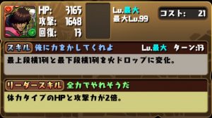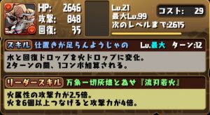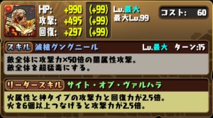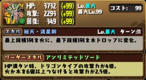 リーダースキルは、火属性と神タイプの攻撃力と回復力が2.5倍。火を6個以上つなげると攻撃力が2.5倍。