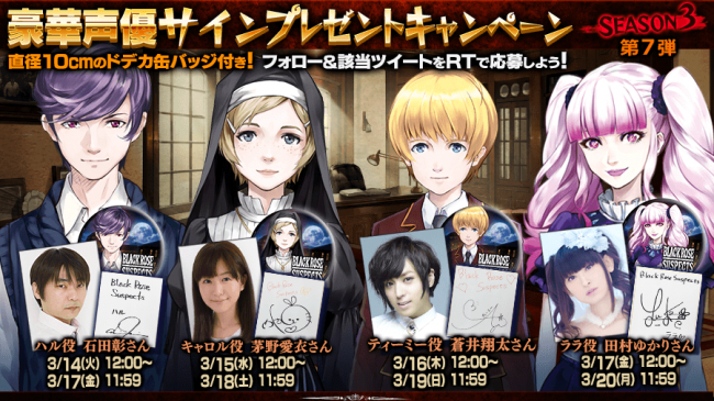 Source: 【本格サスペンスRPG】「Black Rose Suspects」が「ブラサス豪華声優サイン色紙プレゼントキャンペーン シーズン3」第7弾を開催!