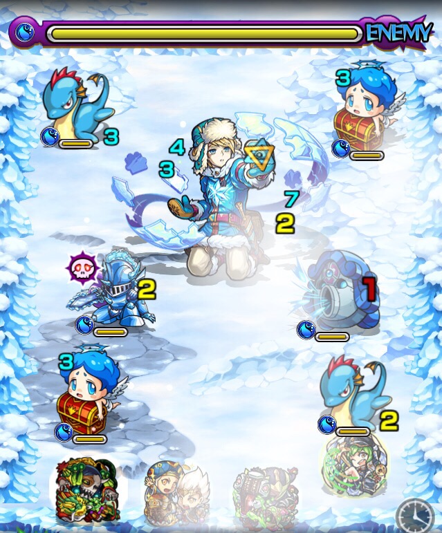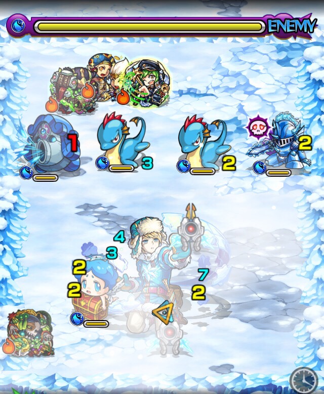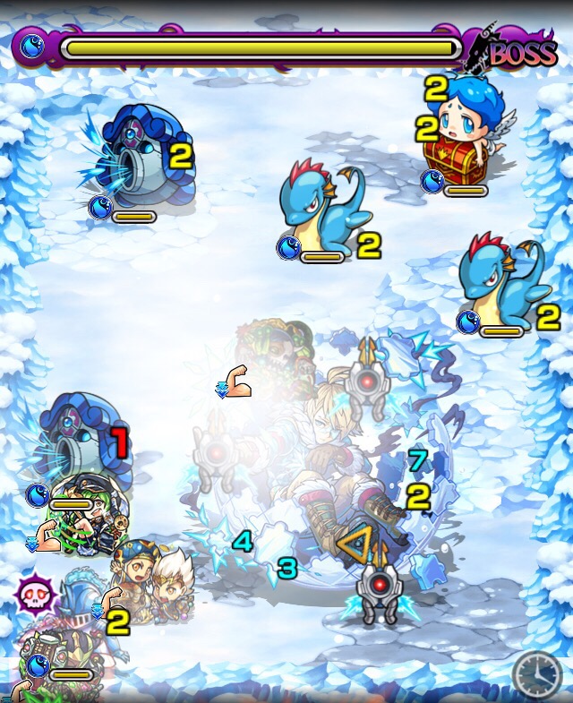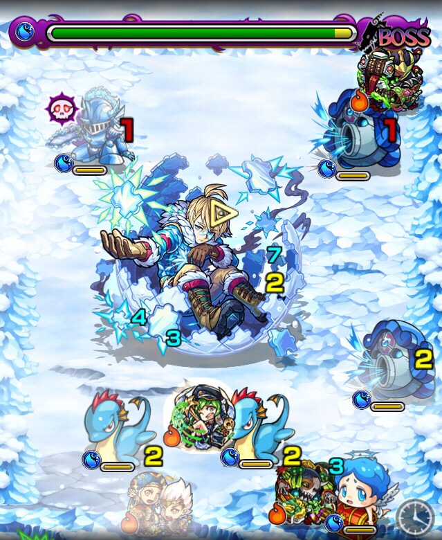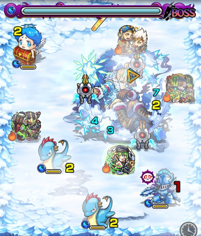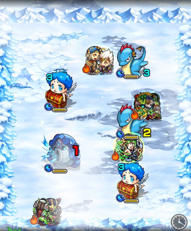 クエスト自体のギミックとしては何も無いですが、ステージ構成が氷河となっておりますので、加熱ポーションをなるべく成長させてから取るようにしましょう。加熱ポーションを取る前は普通の状態が1ターン維持されますが、その後加熱ポーションを取るまでは味方モンスター全員が攻撃力ダウンします。攻撃力ダウンしてしまいますと、通常攻撃の攻撃力が約7割カットされてしまいますので、加熱ポーションを取るようにしましょう。