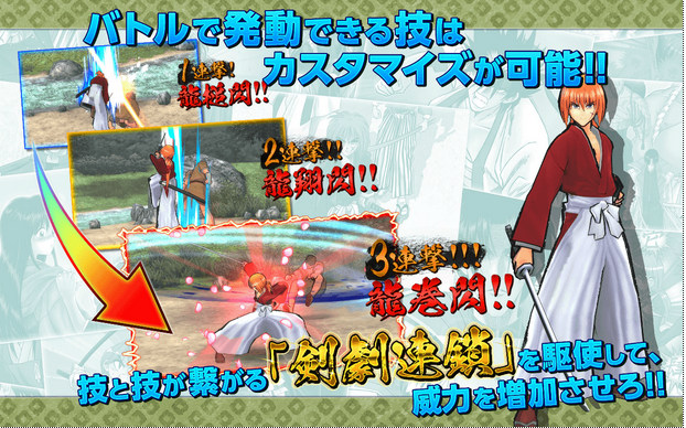 「飛天御剣流」、「二重の極み」、「小太刀二刀流」など、原作に登場した数々の技を使いこなせ!!