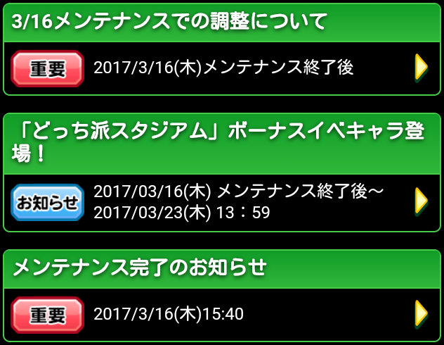 『メンテナンス完了のお知らせ』・『「どっち派スタジアム」ボーナスイベキャラ登場!』・『3/16メンテナンスでの調整について』