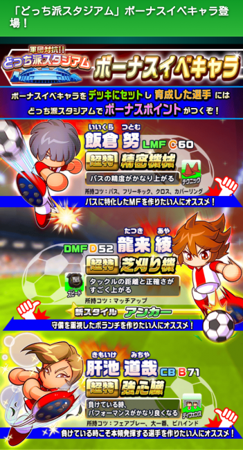 ※ボーナスイベキャラをイベントデッキにセットして育成した選手には、「どっち派スタジアム」でボーナスポイントがつきます。