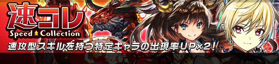 速攻型スキルを持つ特定のキャラの出現率がUP×2しているプレミアムガチャ「速攻コレクションガチャ」が開催中!