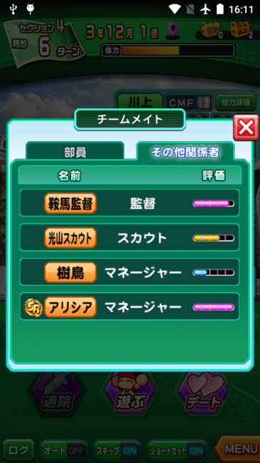 評価は練習のときでも確認できますが、練習にきていなかったチームメイトの評価もここで確認することができます。