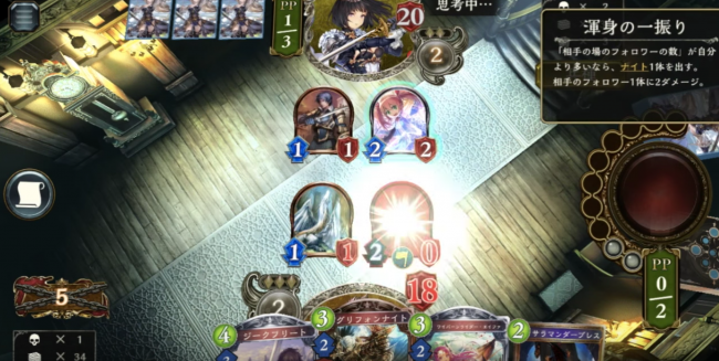 「ダークフォラグーン・フォルテ」の進化疾走で7点を奪えるのは強いのですが、そのためには常に盤面に目を向けて相手のフォロワーをきっちり除去しておきましょう。