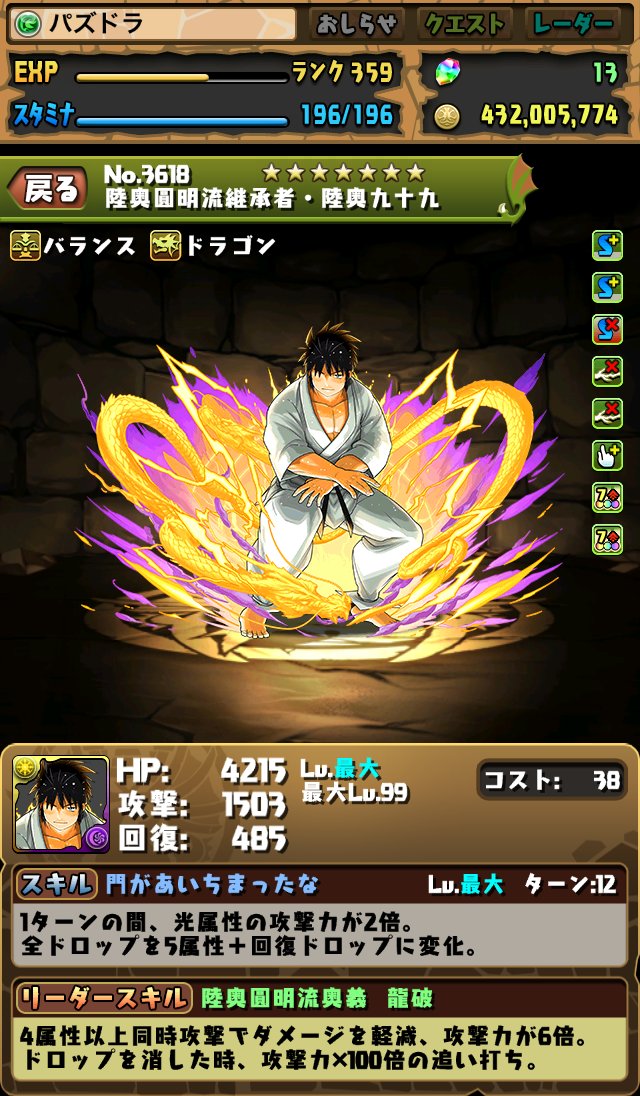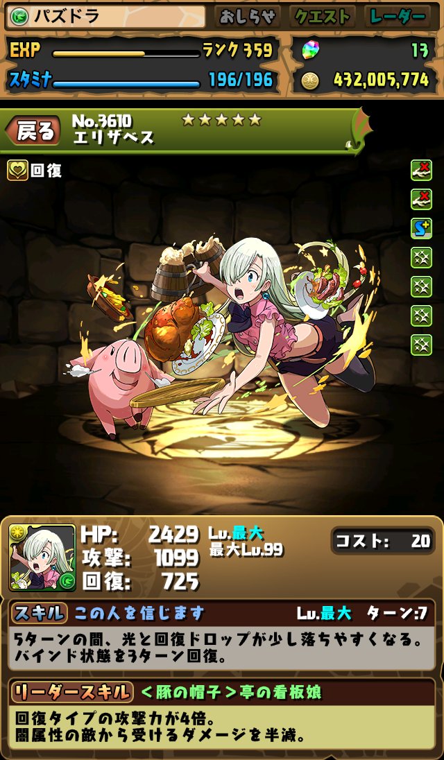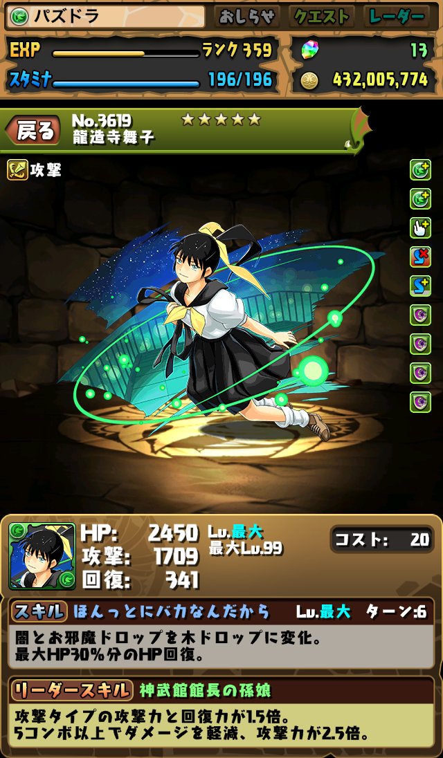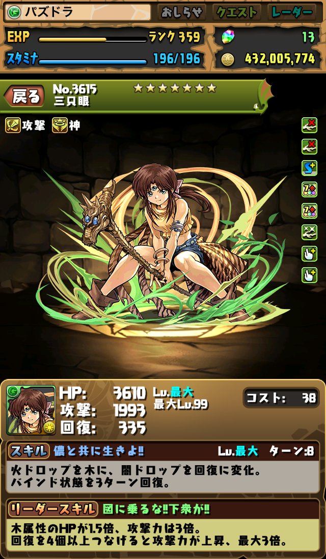 リーダースキルは「木属性のHPが1.5倍、攻撃力は3倍。回復を4個以上つなげると攻撃力が上昇、最大3倍。」となっています。