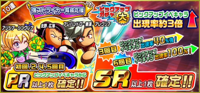 『強ストライカー育成応援ピックアップガチャ大』では、出現率は通常レアガチャの約3倍です。