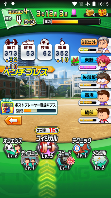 ヒント:フィジカル練習のときにスカウトがなかなかこない場合は、「休む」「遊ぶ」「メンタル」など、体力が減らないものを選んで、スカウトが来るのを待ちましょう。