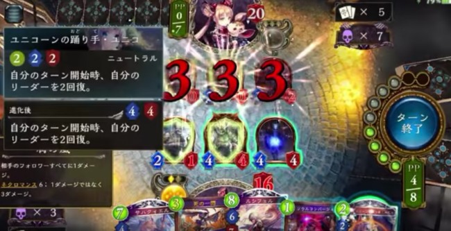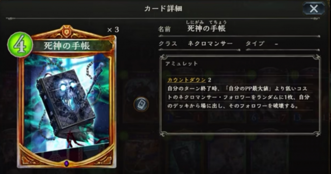 自分のターン終了時、「自分のPP最大値」より低いコストのネクロマンサー・フォロワーをランダムに1枚、自分のデッキから場に出し、そのフォロワーを破壊する。