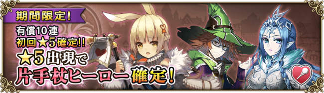 さらに、タイムセール、1回、10回ガチャのご利用回数の合計が30回以内に★5ヒーローが必ず1体以上確定で出現します。