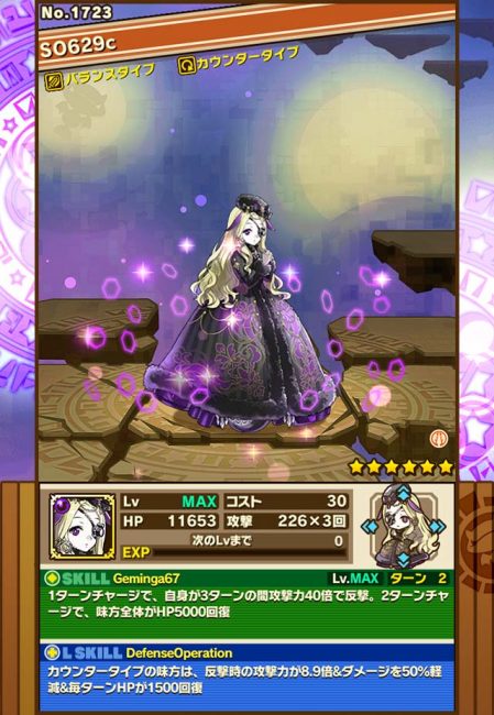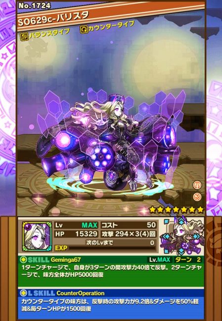 リーダースキルは反撃攻撃力9.2倍、ダメージ50%軽減、毎ターンHP1500回復と超強力性能!