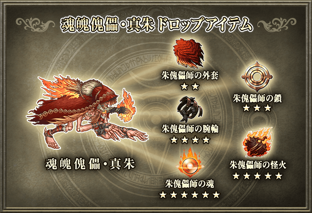 ◆ドロップ素材:朱傀儡師の外套/朱傀儡師の腕輪/朱傀儡師の魂/朱傀儡師の鎖/朱傀儡師の怪火